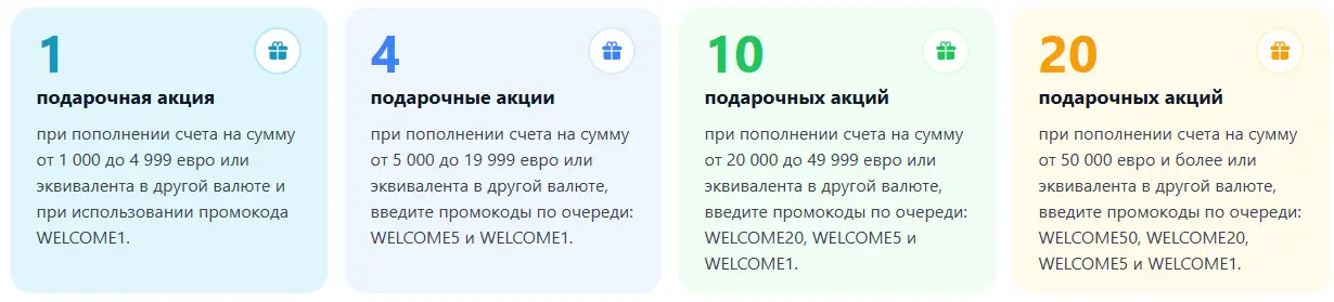 - При пополнении от 20 000 до 50 000 евро: WELCOME20, WELCOME5 и WELCOME1