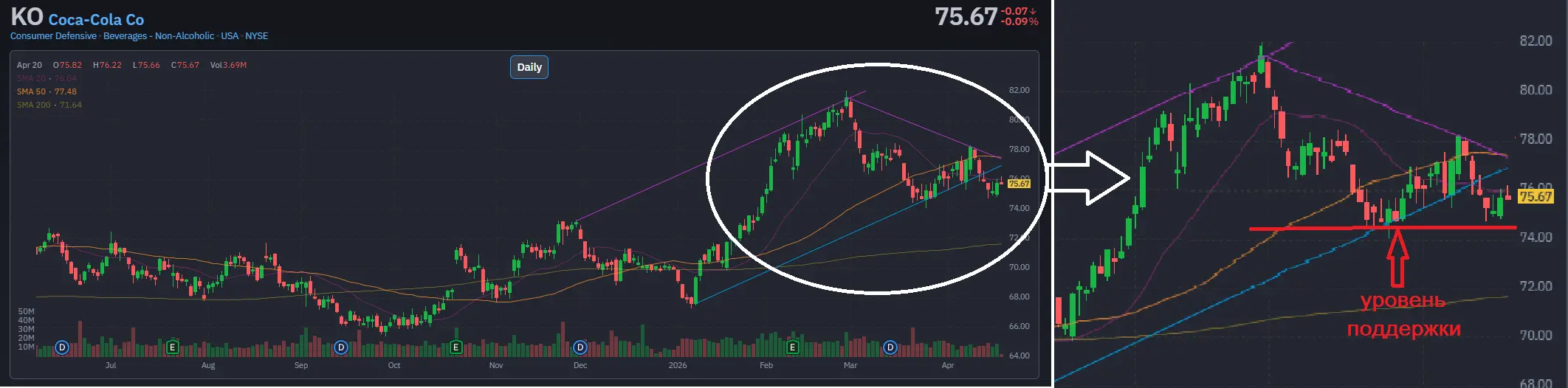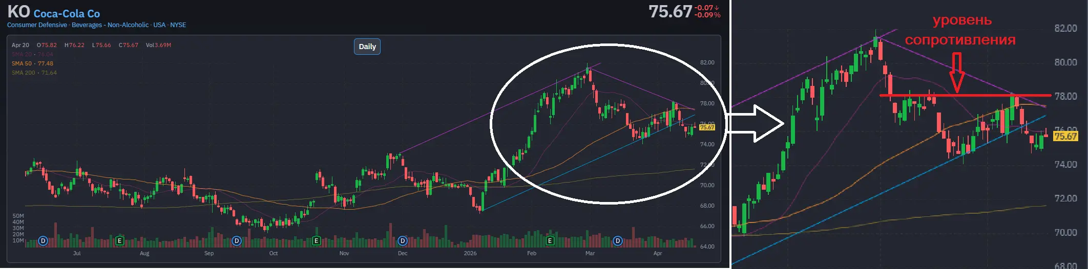 Применимо к фондовому рынку это выглядит так. У тебя, к примеру, есть позиция из 100 акций компании Coca-Cola, которые ты купил, скажем, по 74 доллара. Ты видишь, что последние два месяца цена акции находится ниже 78 долларов, делает попытки их преодолеть, но всякий раз, доходя до 78 долларов, снова опускается ниже. Иными словами, на рынке сейчас такая ситуация, что инвесторы считают цену акции Coca-Cola выше 78 долларов переоценённой и всякий раз прекращают свои покупки, когда цена доходит до этого уровня.