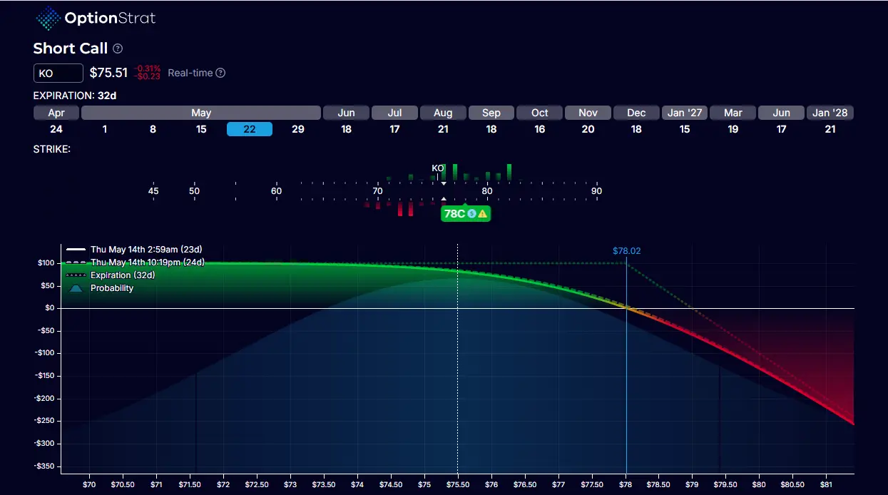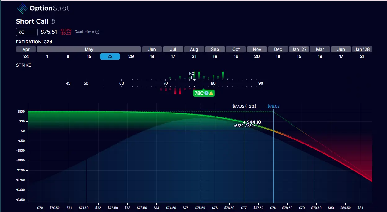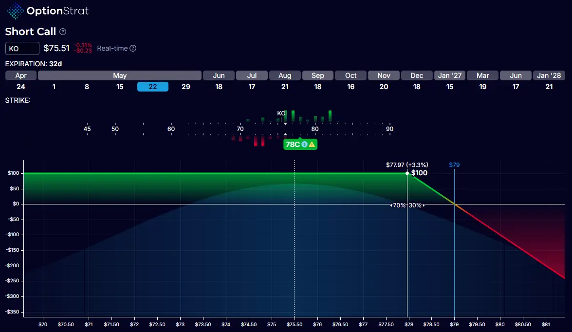 Ты хочешь извлечь из своего анализа выгоду и продаёшь Call опцион на ближайшие 30 дней со страйком 78 долларов. Такой опцион приносит тебе премию в размере 100 долларов. Это реальный пример, посмотри на скриншот.
