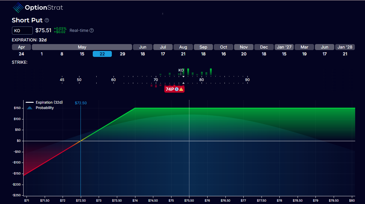 Да, именно так и будут действовать многие инвесторы. Многие, но не ты. Ты знаком с опционами и продаёшь Put опцион со страйком 74 доллара на ближайшие 30 дней и получаешь за него премию в размере 150 долларов. Что это тебе даёт? А то, что если цена акции компании Coca-Cola к моменту экспирации опустится до 74 долларов или ниже, то ты будешь обязан купить акции компании Coca-Cola по ожидаемой цене в 74 доллара.